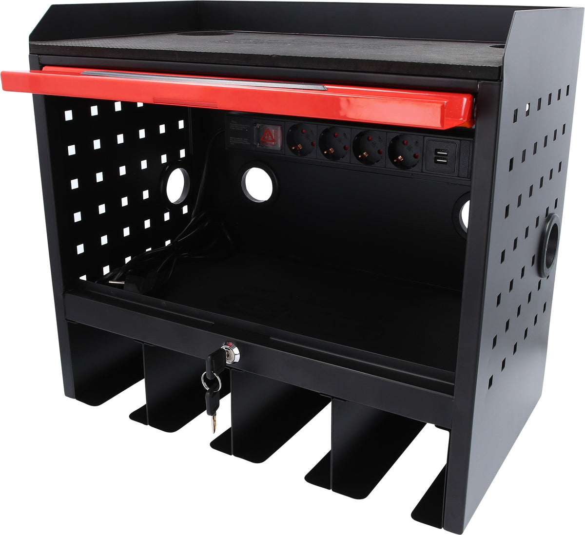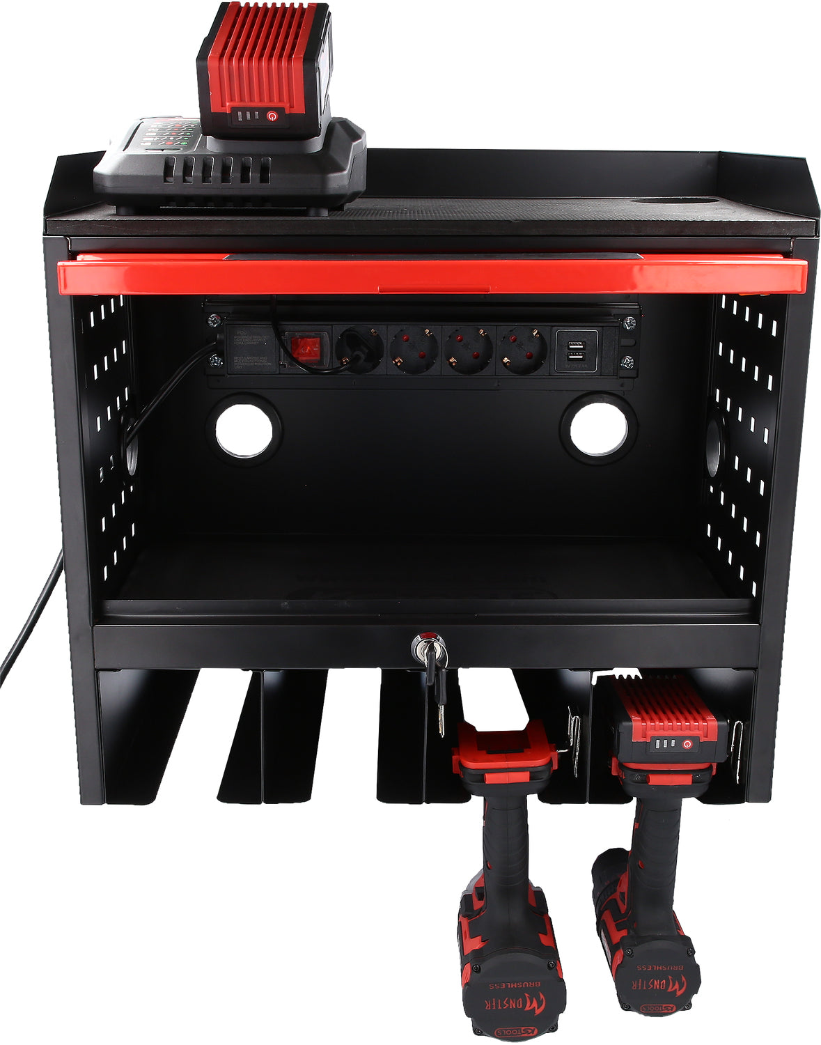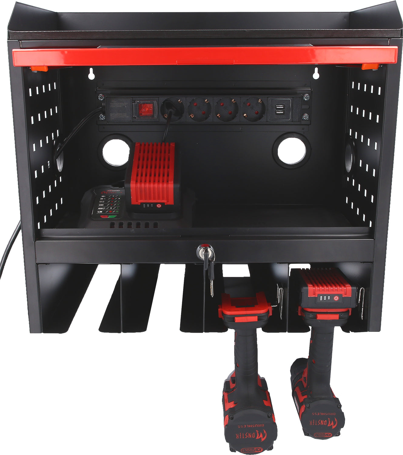 eMONSTER gereedschapskast 515.6901 voor wandmontage, met een stabiele constructie van plaatstaal - Met cilinderslot en gatenpatroon - Inclusief 4-voudige stekkerdoor en ruimte voor 18V accumachines - Organiseer uw accessoires!