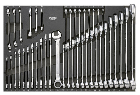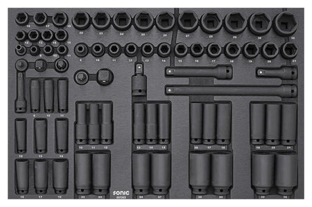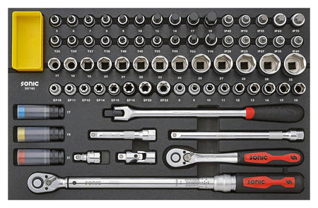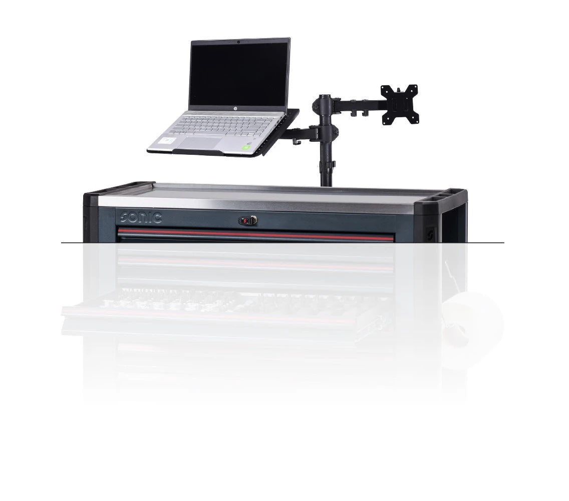 De S9 NEXT 20-jarig Jubileum gereedschapswagen is een exclusieve uitgave beperkt tot slechts 750 genummerde exemplaren, uitgevoerd in diep zwart. Deze bijzondere versie wordt geleverd met een omvangrijke set van 430 gereedschappen, zorgvuldig gerangschikt in geoptimaliseerde schuim inlays van het Sonic Foam System, ontworpen om snel gereedschap te vinden en je verzameling compleet te houden. De set bevat een zorgvuldig gekozen assortiment van Sonic’s meest recente gereedschappen, inclusief een geavanceerde momentsleutel, een reeks ultradunne ratelsleutels en TX-plus doppen en dopsleutels. Verder omvat deze uitgave houders voor een laptop, monitor en tablet, die een veilige bevestiging mogelijk maken en tegelijkertijd de werkruimte onbelemmerd laten.
