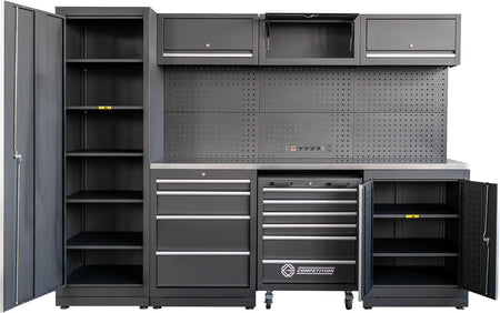 Kogelgelagerde Laden: Het systeem bevat een geïntegreerde gereedschapswagen (6 laden) en een extra onderbouwkast (4 laden). Alle laden zijn kogelgelagerd en hebben een belastingcapaciteit van maximaal 35 kg, waardoor ze geschikt zijn voor zware dopsleutelsets en momentsleutels.