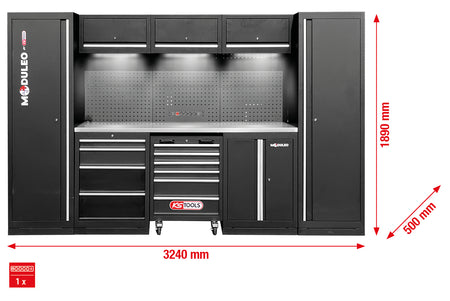 | Afmetingen (BxDxH) | 3240 x 500 x 1890 mm | Maximale lineaire werkruimte in één compacte diepte (50 cm). |