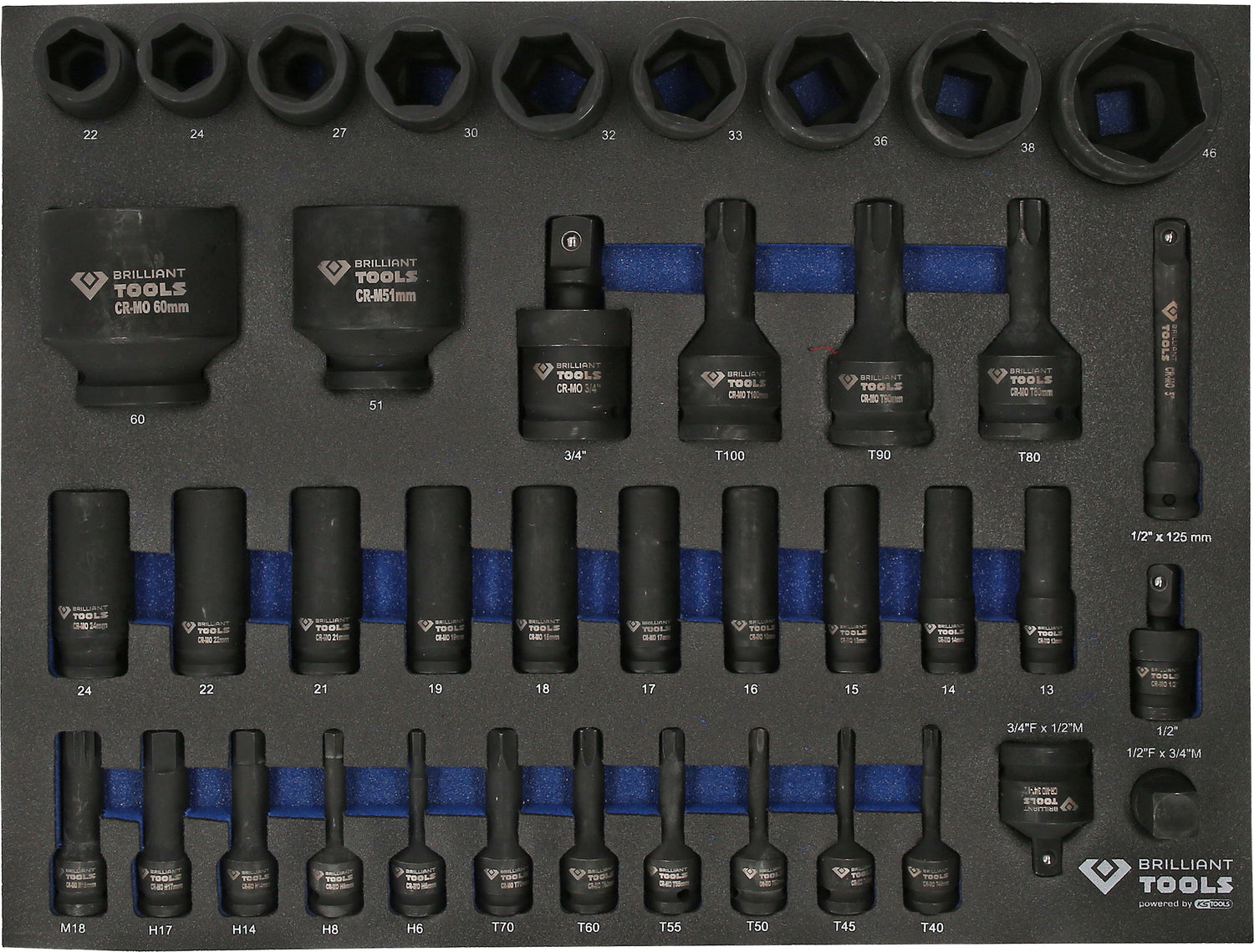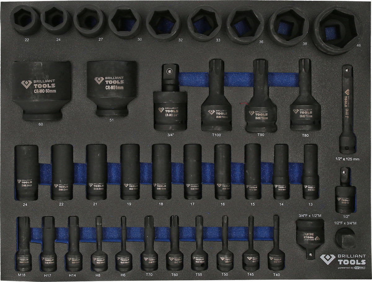- 1 zeskantkrachtdopsleutel, kort, in de maten 22, 24, 27, 30, 32, 33, 36, 38, 46 mm