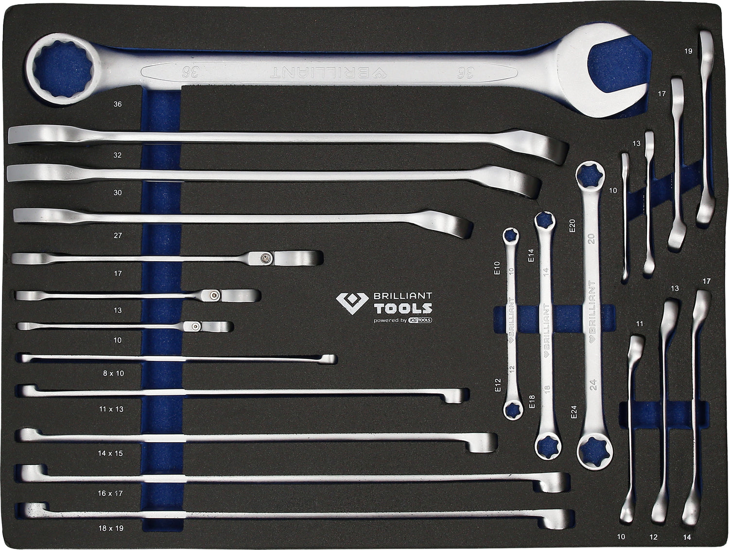 - 1 zeskantkrachtdopsleutel, lang, in de maten 13, 14, 15, 16, 17, 18, 19, 21, 22, 24, mm