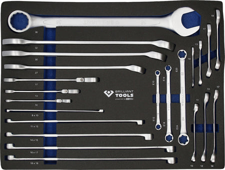- 1 dubbele ringsleutel in C-vorm, in de maten 10x11, 12x13, 14x15, 16x17, 18x19 mm