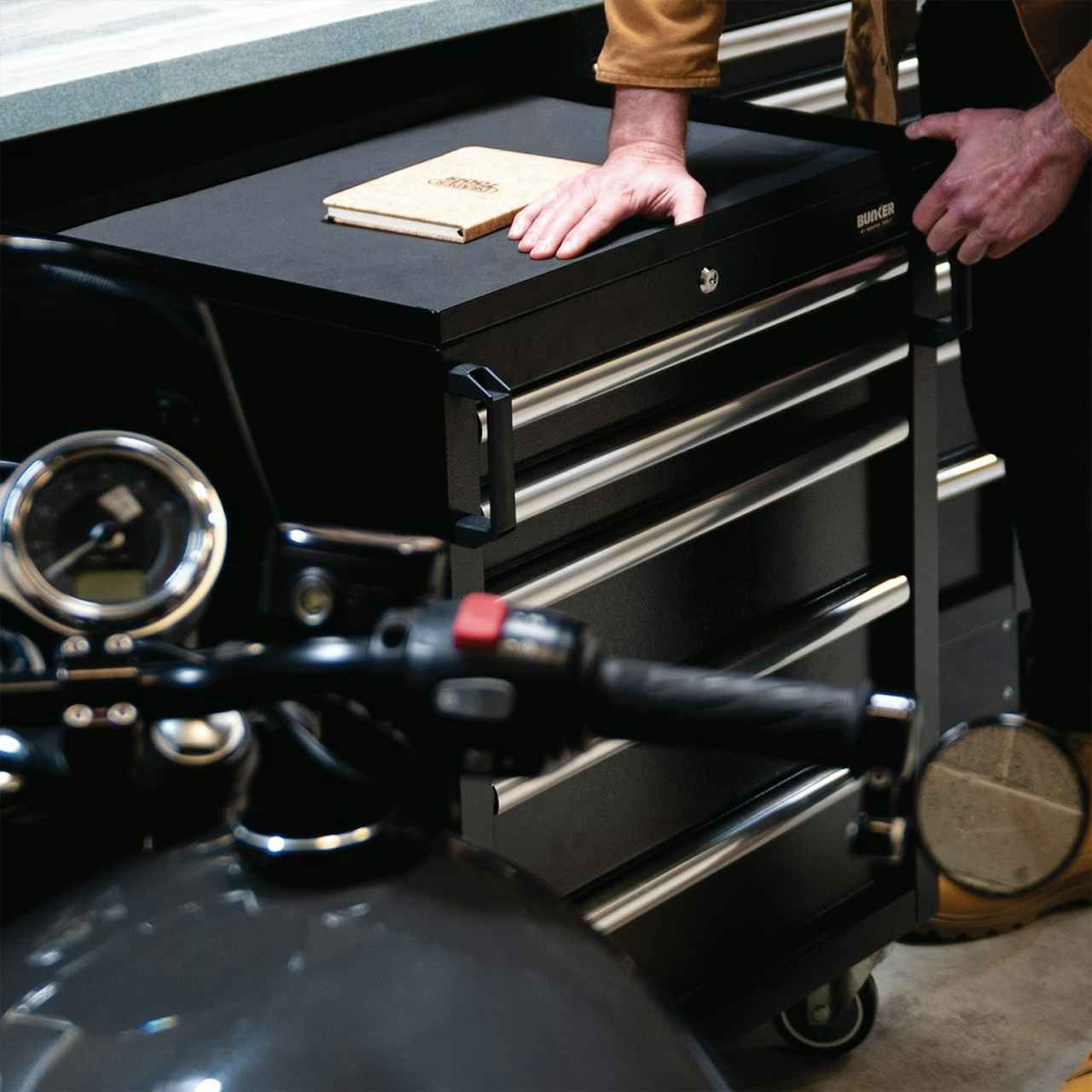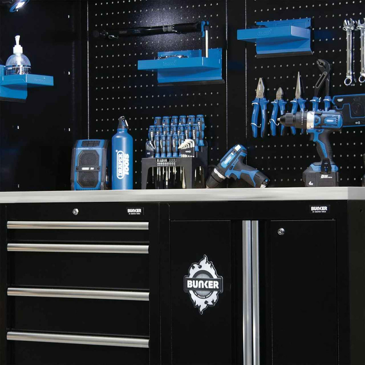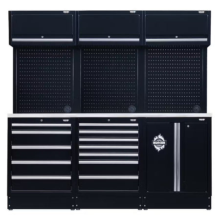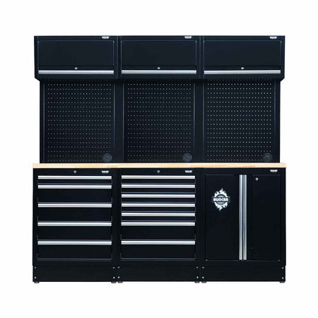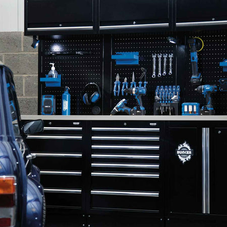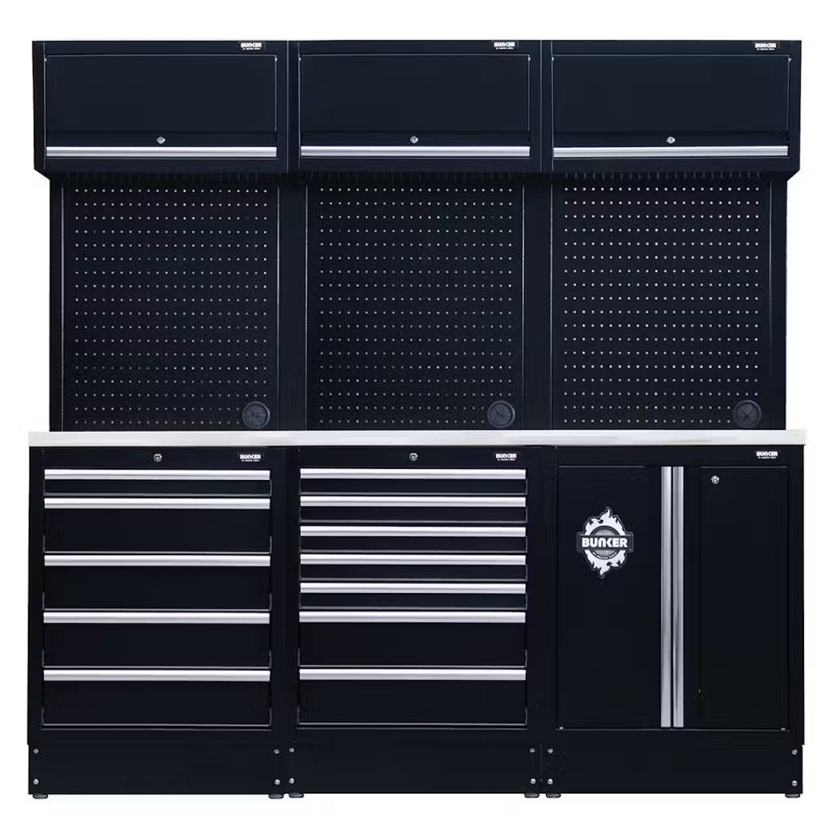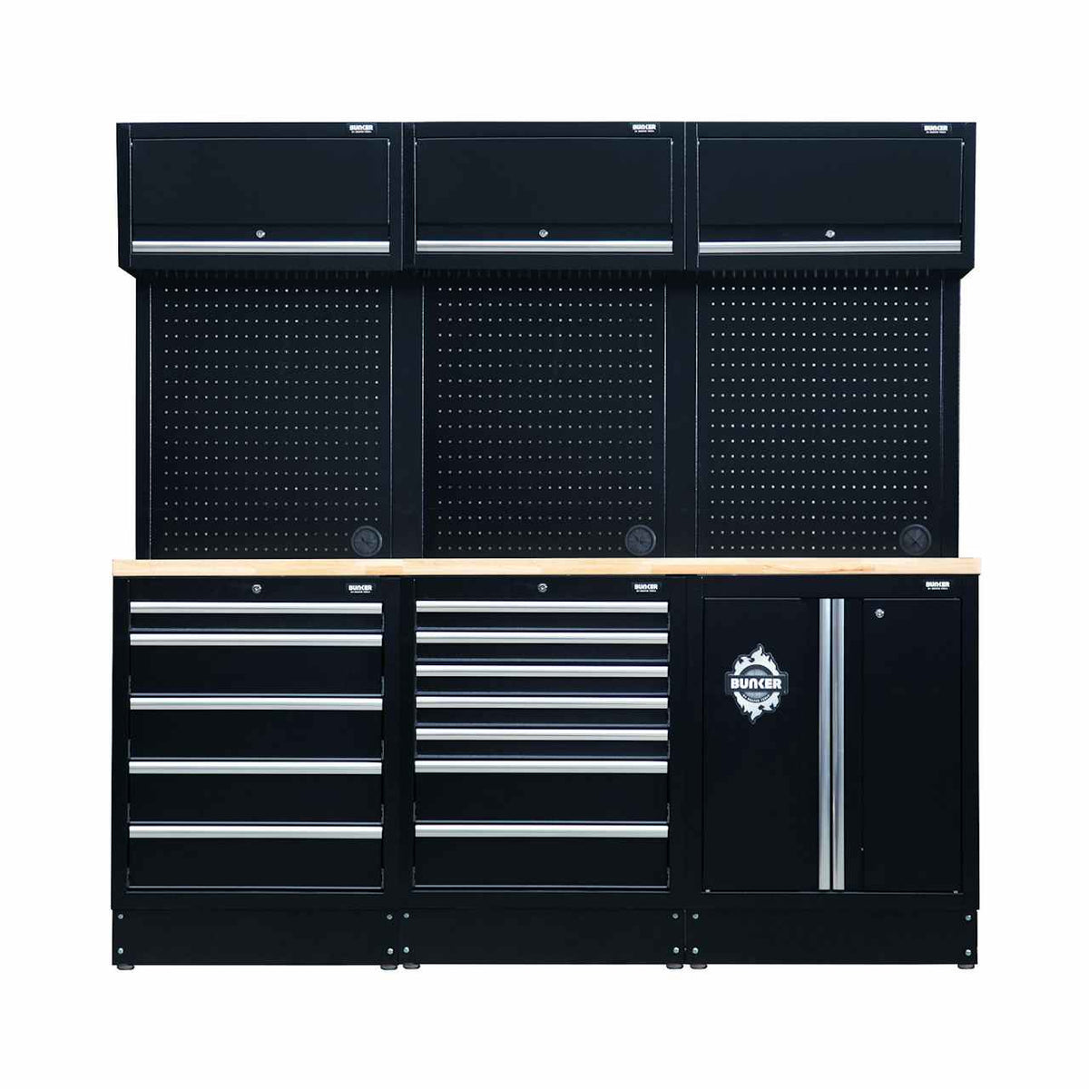 De BUNKER® 14-delige modulaire opbergcombinatie, verkrijgbaar met een werkblad van hardhout of roestvrij staal, is de ideale opbergoplossing voor garages, werkplaatsen en meer. Deze 2040mm modulaire combinatie bevat een verscheidenheid aan vloerkasten, wandkasten, pegboard panelen en muurbeugels, en biedt alles wat je nodig hebt om je ruimte te transformeren en te optimaliseren.